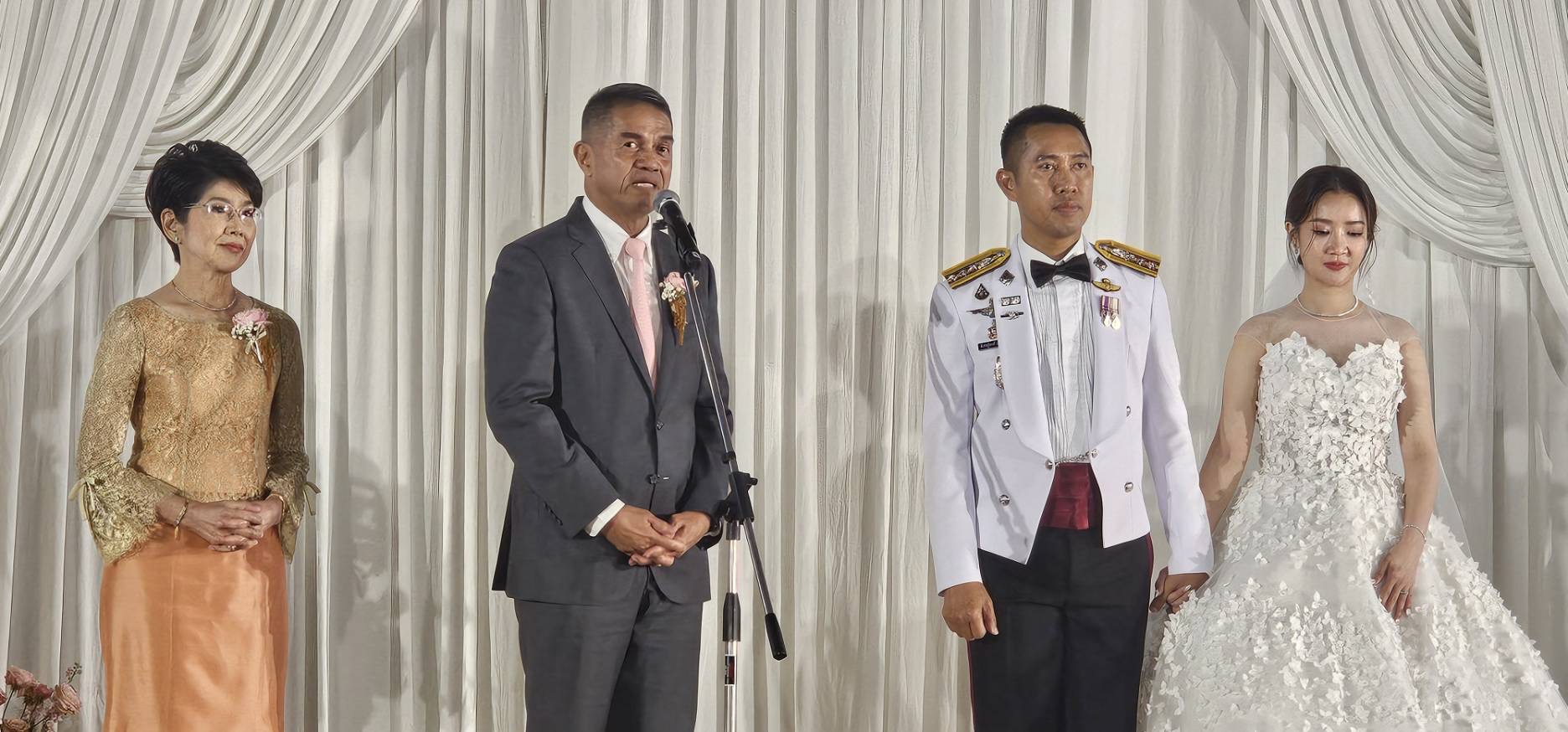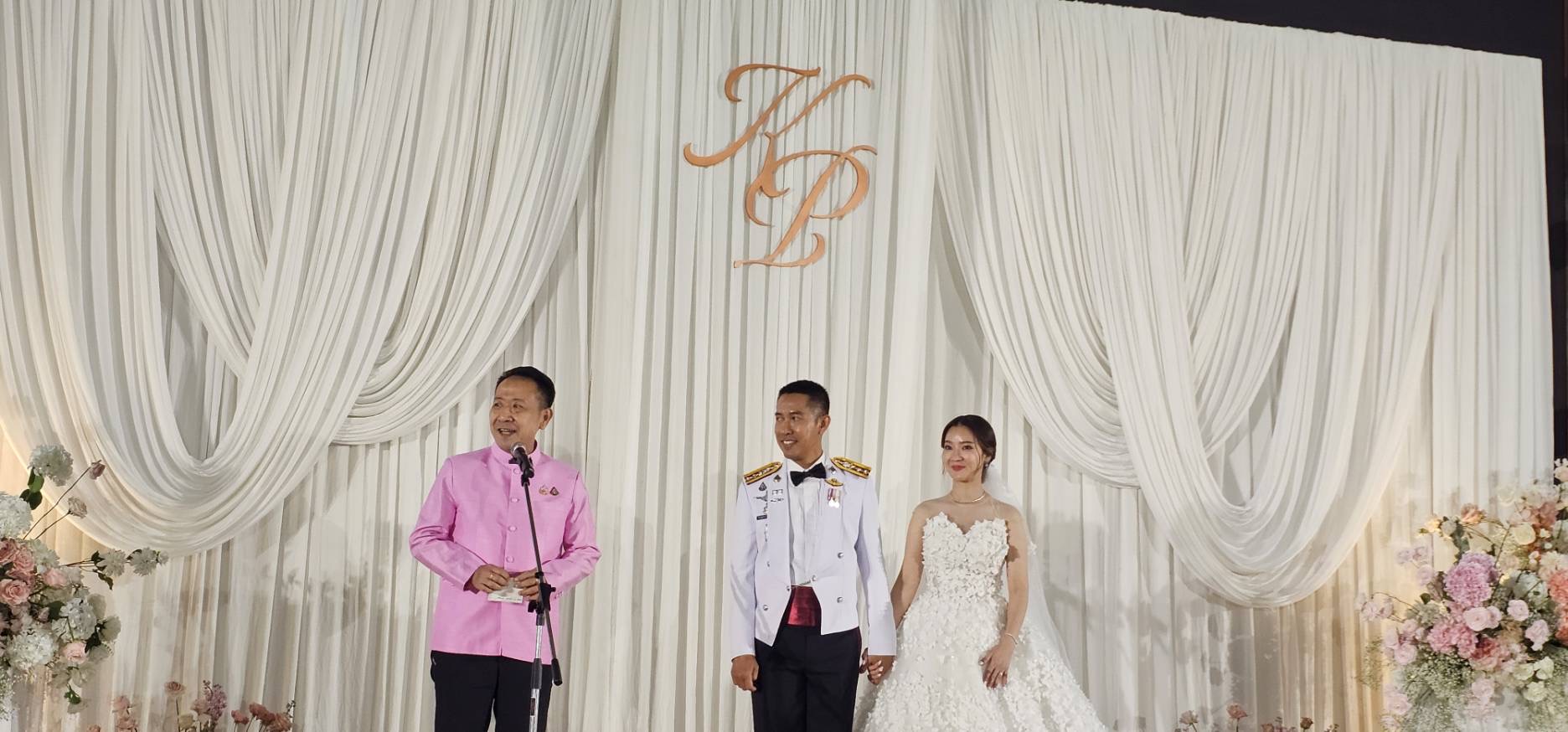 ในงานได้รับเกียรติจาก พลตำรวจเอกรุ่งโรจน์ แสงคร้าม อดีตรองผู้บัญชาการตำรวจแห่งชาติ และ นายนริศ นิรามัยวงศ์ ผู้ว่าราชการจังหวัดชลบุรี (อดีตผู้ว่าราชการจังหวัดสมุทรสาคร) ขึ้นกล่าวอวยพรและให้พรชีวิตคู่แก่บ่าวสาวอย่างอบอุ่น สร้างรอยยิ้มและเสียงปรบมือก้องทั้งห้องจัดเลี้ยง
